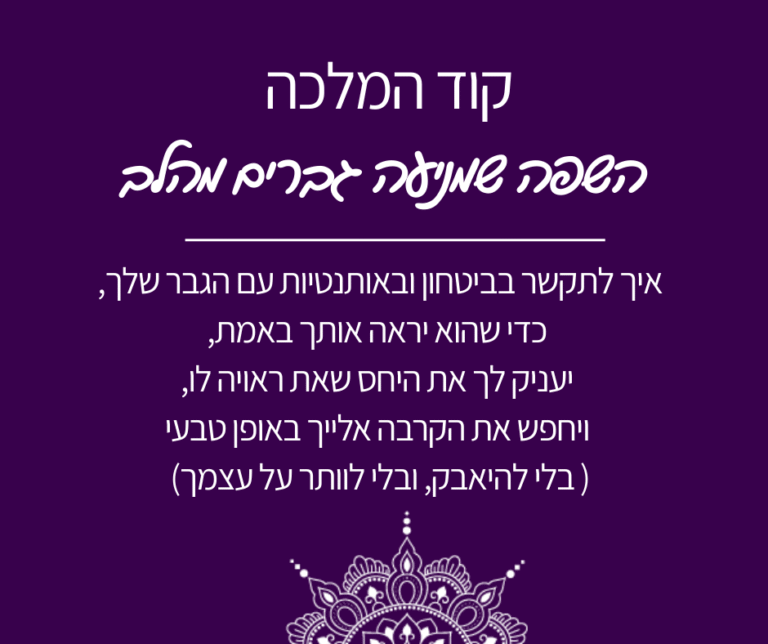איך תייצרי קירבה בקשר בצורה שמותאמת לך, ללא מאמצים "טריקים" או "שיטות", אלא באנרגיה נעימה וכתוצאה תגלי צדדים מדהימים של נתינה ואהבה שככל הנראה לא הכרת בגברים.